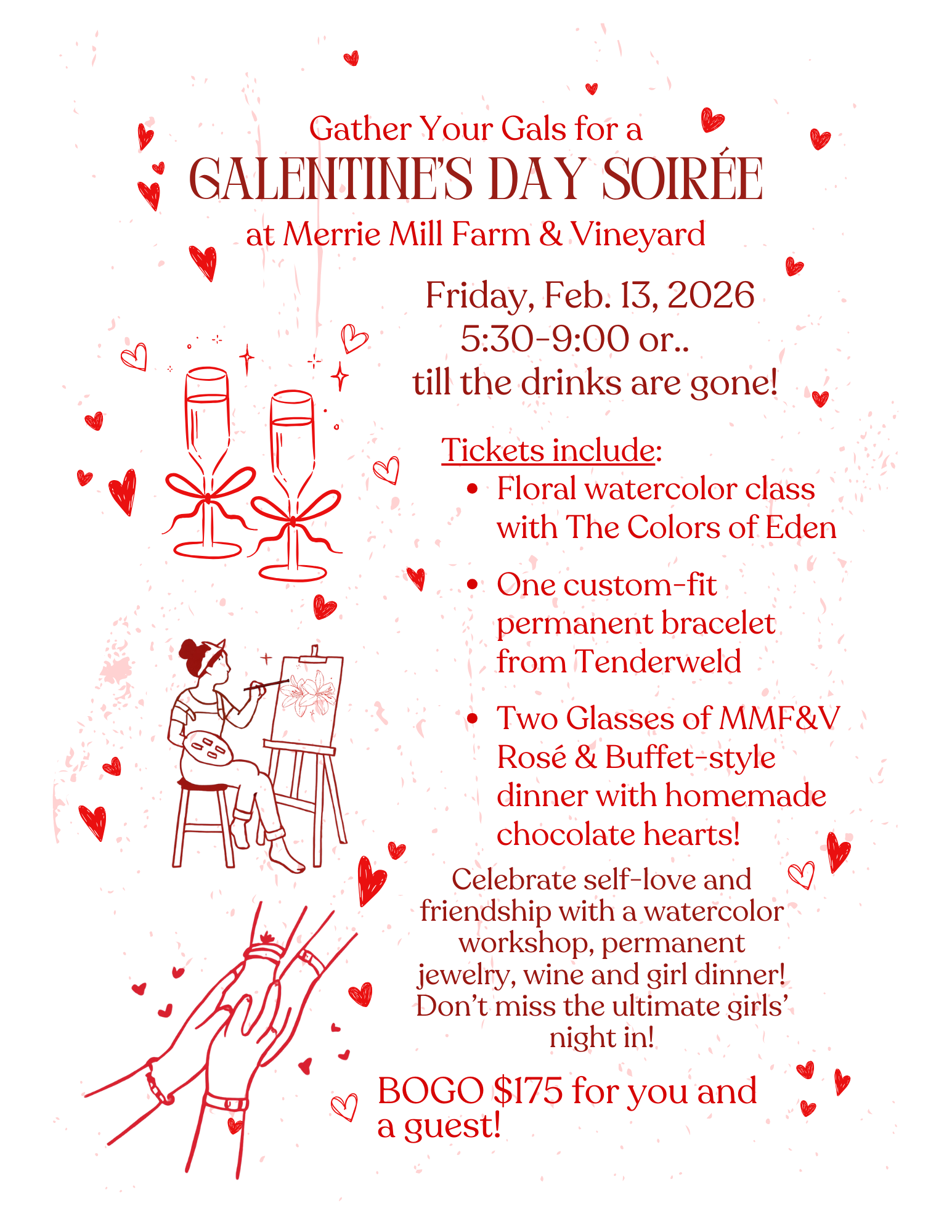 Get ready for a fabulous Galentine's Day celebration filled with wine, laughter, and unforgettable moments at Merrie Mill Farm & Vineyard!
