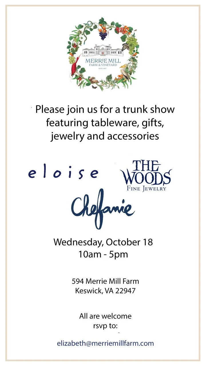 Merrie Mill Farm & Vineyard's Trunk Show Wednesday, October 18, 2023 10:00 AM 5:00 PM Google Calendar ICS