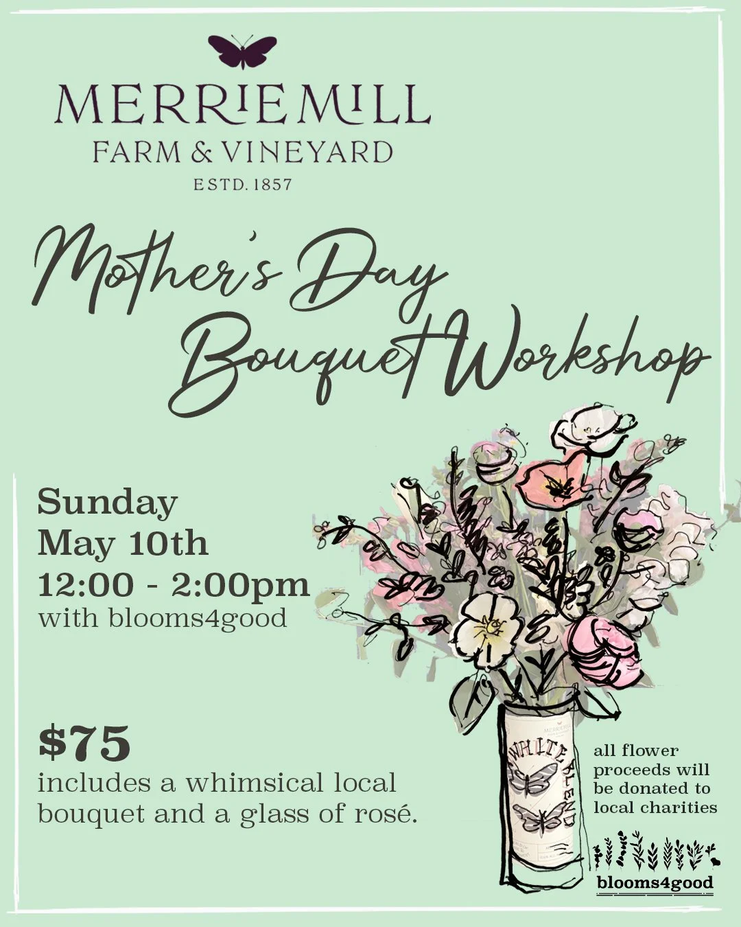 Join us on Mothers Day, Sunday, May 10th, 2026, from 12:00 to 2:00 PM for a floral bouquet workshop using Merrie Mill's unique wine bottles as vases and Blooms4Good locally grown flowers for the perfect gift for Mother's Day. We are joining hands with Kate & Kira of Blooms4Good to use the proceeds from this workshop to support SARA (Sexual Assault Resource Agency) and International Neighbors in Charlottesville, VA.